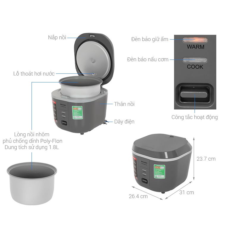 - Dung tích 1.8 lít, thích hợp cho gia đình 4 – 6 người, nấu cơm nhanh gọn cho bữa ăn hằng ngày.